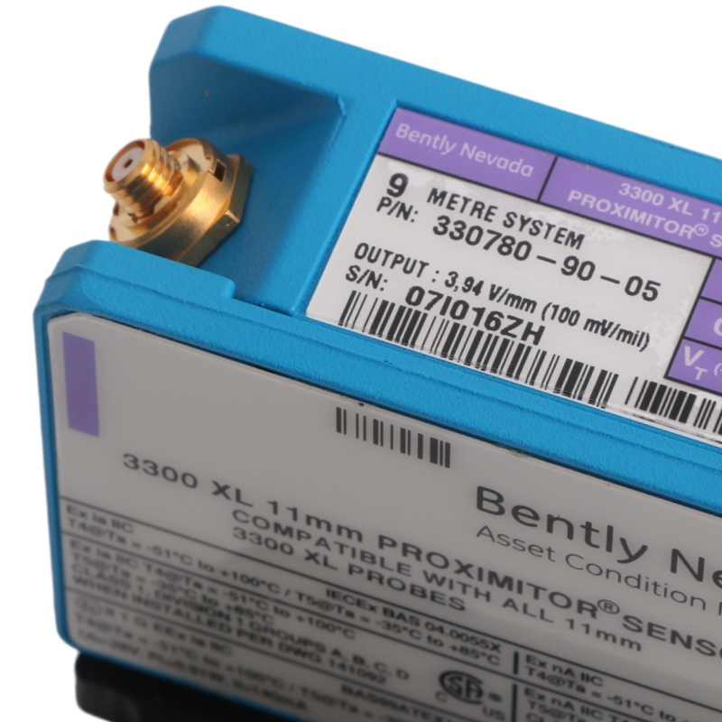 The Bently Nevada 330780-90-05 3300 XL 11 mm Proximitor Sensor is primarily used for vibration monitoring and shaft displacement measurement of high-speed rotating machinery. This sensor is widely applied in industries such as power generation, petrochemical, natural gas, pulp and paper, aerospace, and heavy machinery.