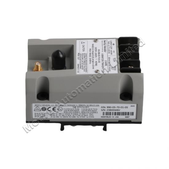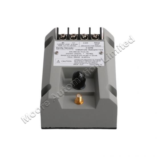 The 990-05-70-01-05 990 Vibration Transmitter is intended primarily for the original equipment manufacturers (OEMs) of centrifugal air compressors or small pumps, motors, or fans who prefer to provide a simple 4 to 20 mA proportional vibration signal as the input to their machinery control system. The transmitter is a two-wire, loop-powered device that accepts input from our 3300 NSv proximity probe and its matching extension cable (available in 5 m and 7 m system length options).The transmitter conditions the signal into appropriate peakto-peak vibration amplitude engineering units, and provides this value as a proportional 4 to 20 mA industry-standard signal as the input to the control system where machinery protection alarming and logic occurst.