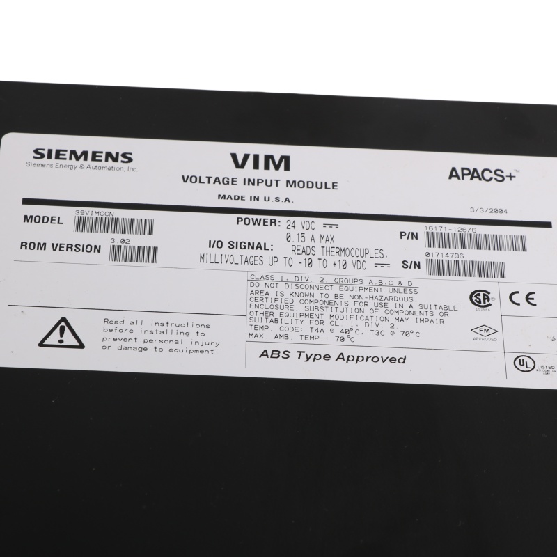 The Siemens 39VIMCCN 16171-126/6 is a Voltage Input Module (VIM) used in industrial automation systems. |